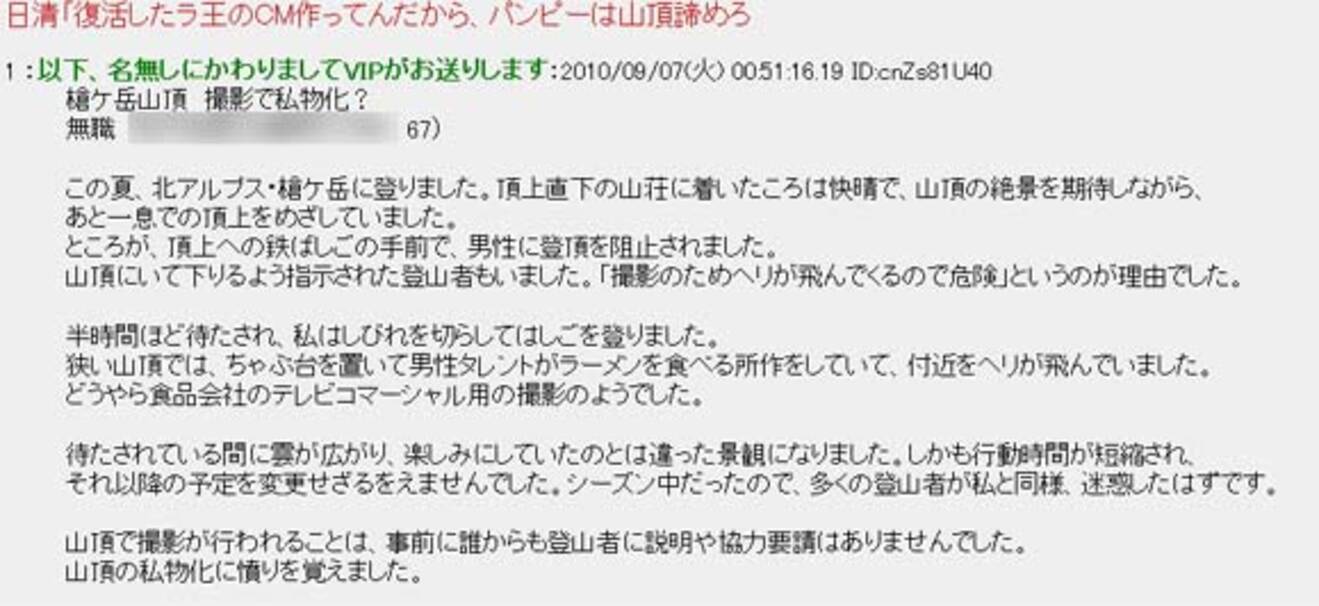 ラ王cm撮影で山を封鎖し登山者激怒 日清 ご迷惑をおかけして申し訳なかった 2010年9月7日 エキサイトニュース