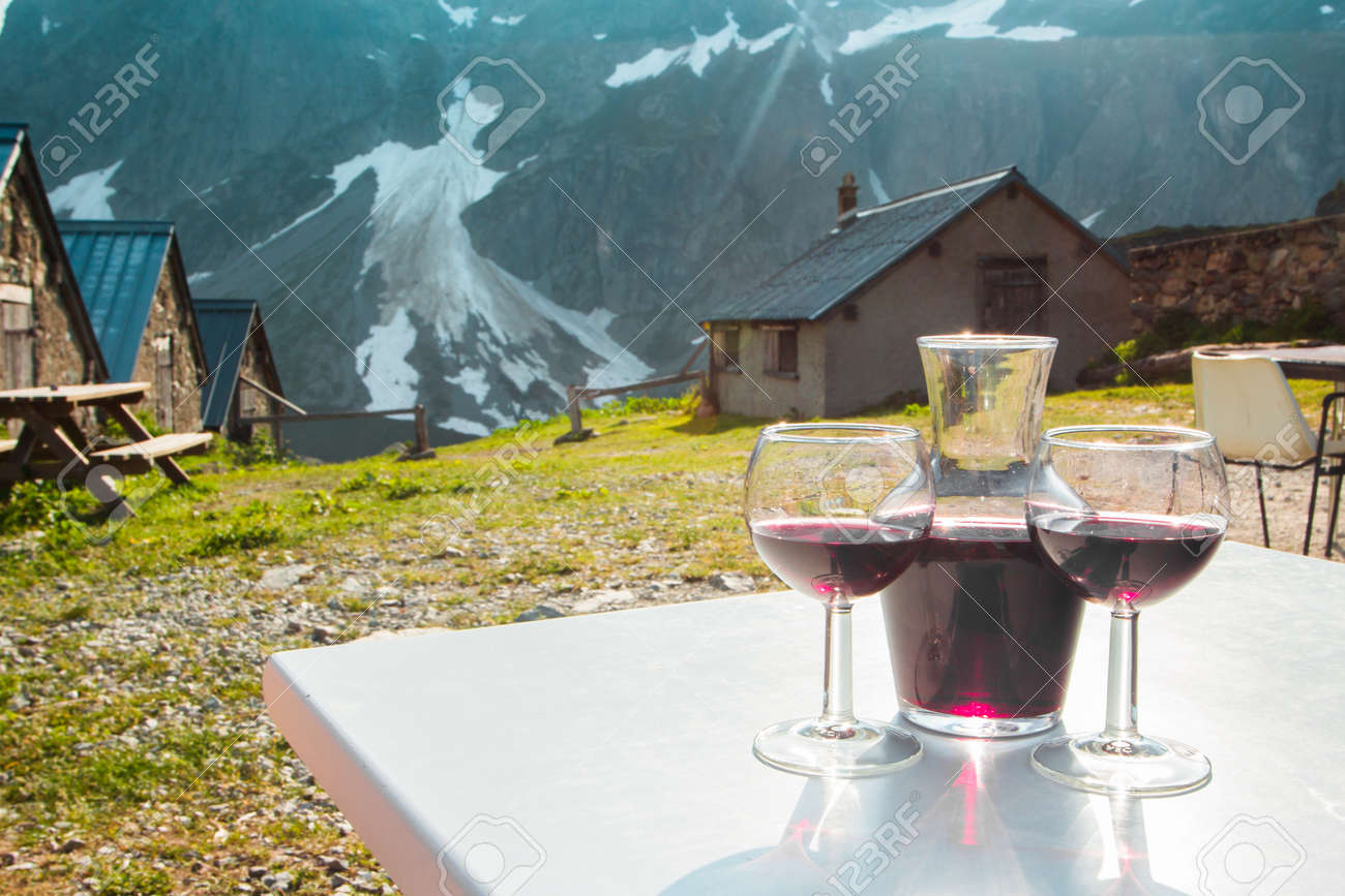 山の中のグラスとボトルにワインを入れたダイニングテーブル の写真素材 画像素材 Image 94726958