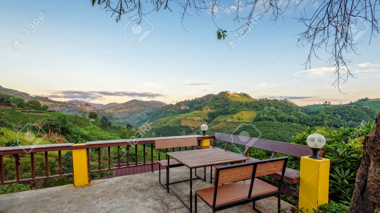 テーブルしダイニングのテラスに椅子し 森と土井メイ Salong チェンライ タイの視点で朝雰囲気の中で山の美しい自然の風景をお楽しみください の写真素材 画像素材 Image 85566575