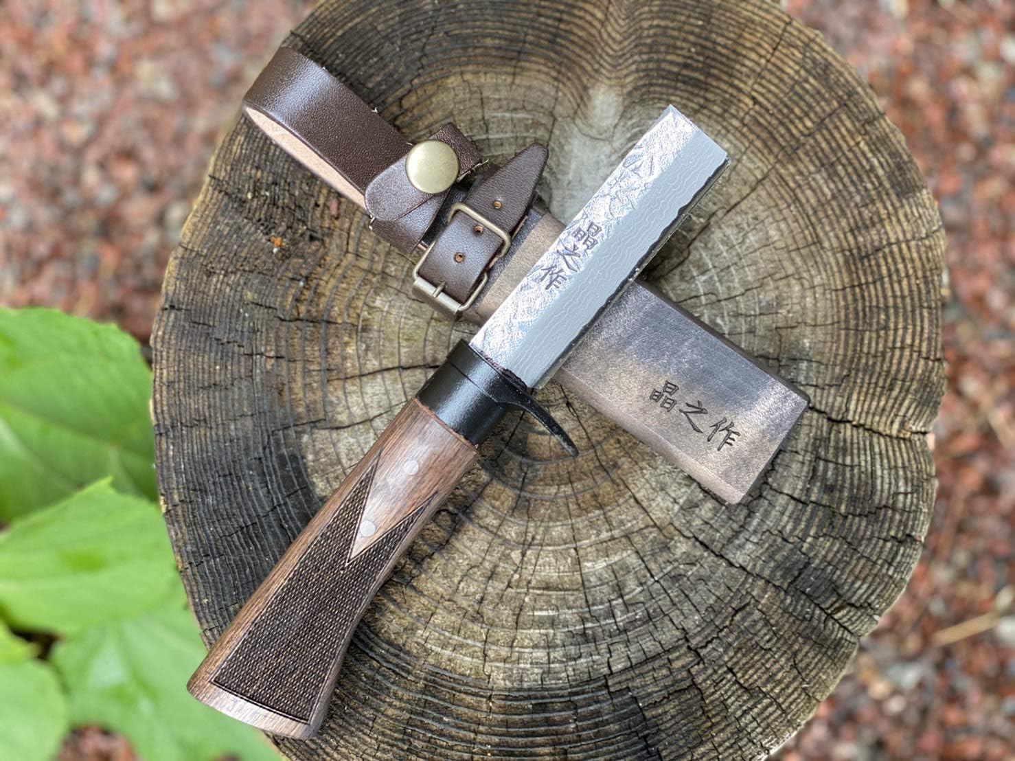 緑 青紙二号鋼 ダマスカス山遊鉈 剣鉈 全曇り キャンプ 本革 樫柄 和鋼 チェッカー ナイフ アウトドア レザーケース 6寸 ダマスカス15層 黒鉄輪 両刃 国産 180mm Test Prismmagazine Ca