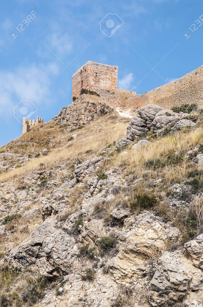 アルバラシン中世城の眺めがスペイン テルエルにある 岩 垂直画像を山を参照してください の写真素材 画像素材 Image 22695455