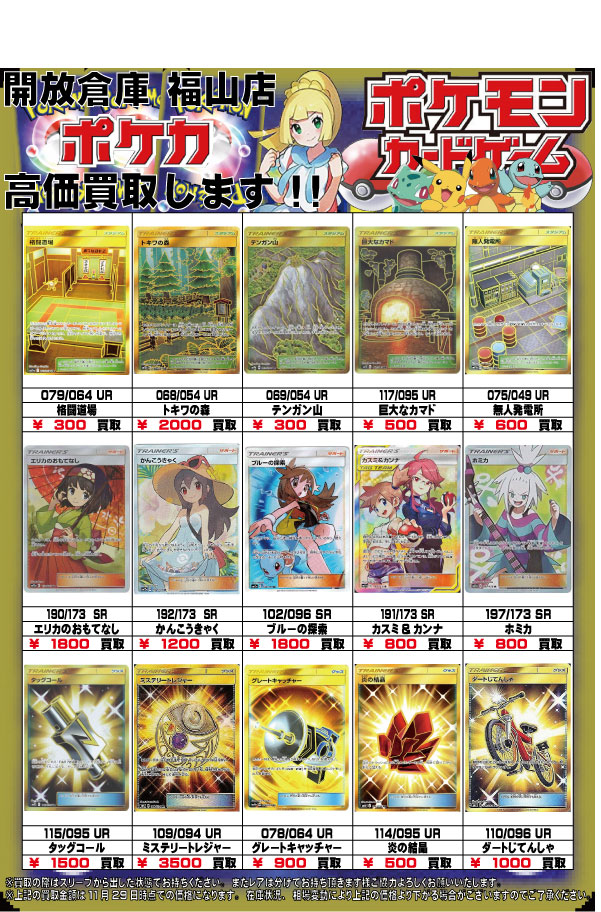 福山店 買取 福山店 12月 カード高価買取チラシ リユースショップ開放倉庫 古本 Cd Dvd ゲーム おもちゃ 楽器 釣具 アウトドア スポーツ 古着 アクセサリ 雑貨 電化製品 販売買取