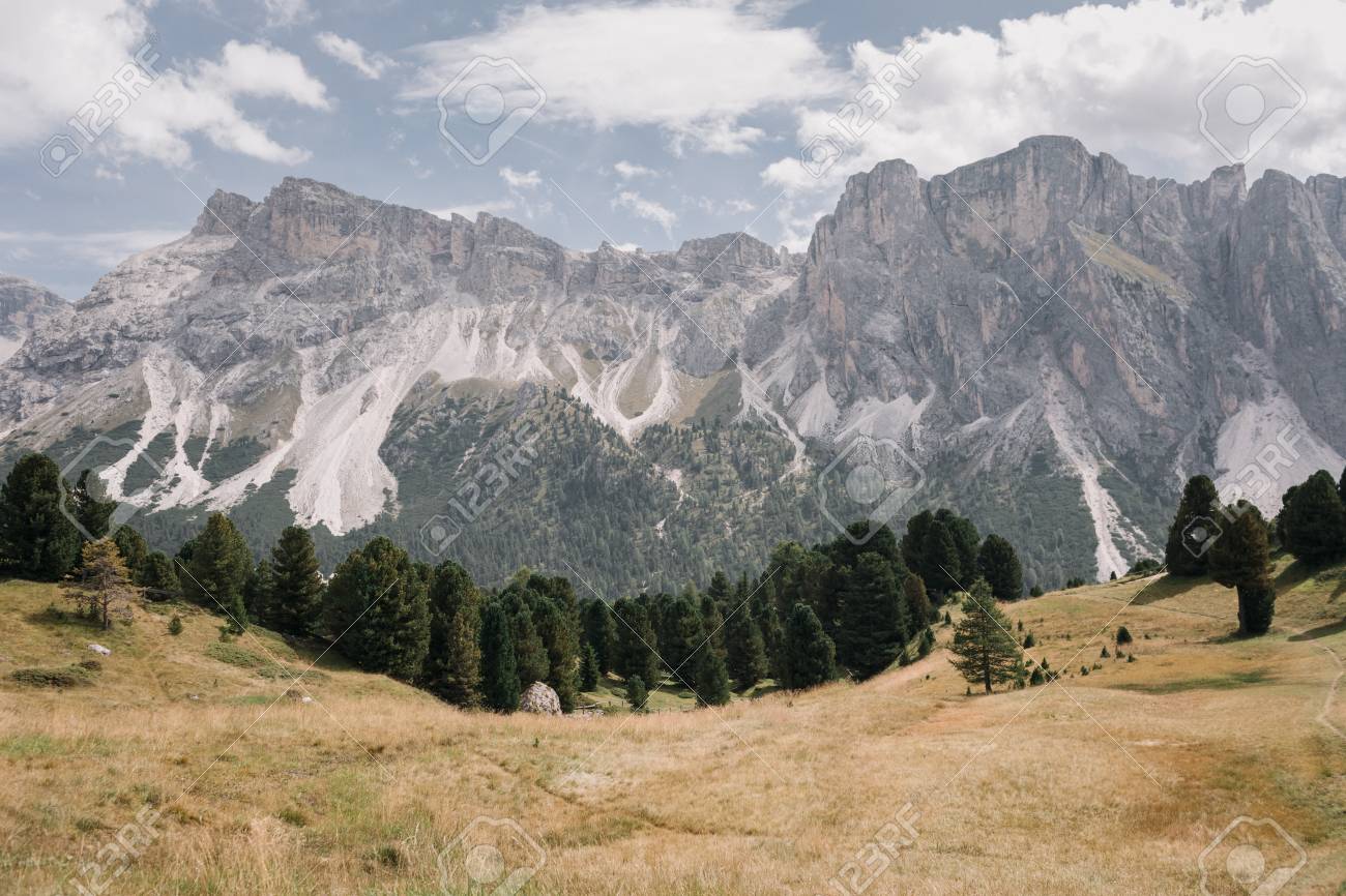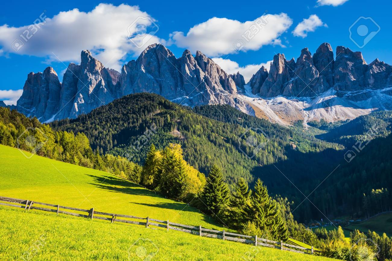 ドロミテの晴れた日 絵のように美しいヴァルディフーネス 緑のアルプスの牧草地に囲まれたロッキー山脈と森の山 の写真素材 画像素材 Image 89679973