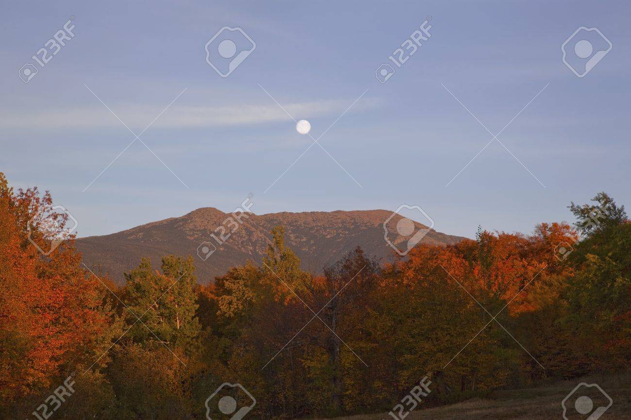 10 月中旬の山 Franconia 範囲のニューハンプシャーの白い山のラファイエット以上上昇しているハンターの月 夕日の背後にある青い空とフォア グラウンドでオレンジと赤の秋の紅葉が点灯します の写真素材 画像素材 Image 10972418