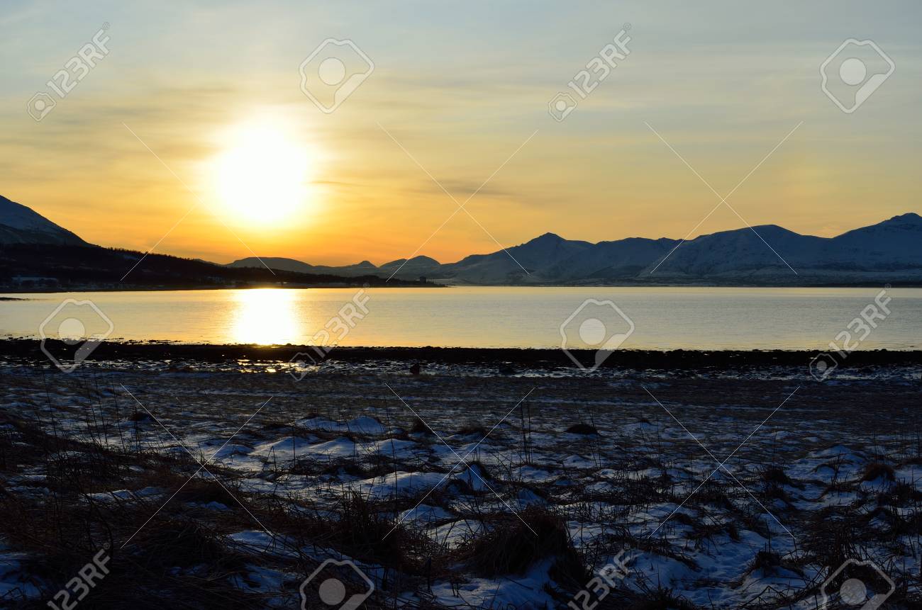 雪の山とフィヨルド フィールド上黄金の日の出の空 の写真素材 画像素材 Image 73101601