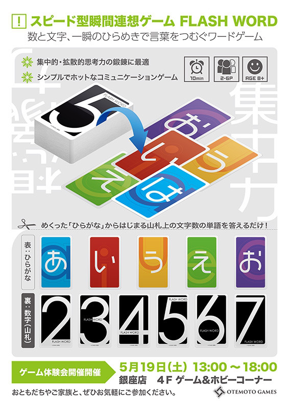 東急ハンズ池袋店 Twitterren 体験会のおしらせ めくったひらがなと山札の数字から一瞬のひらめきで言葉をつむぐワードゲーム Flash Word シンプルでホットなこちらのコミュニケーションゲームの体験会を6 9 土 12 00 17 00 ハンズ池袋店7fにて開催いたし