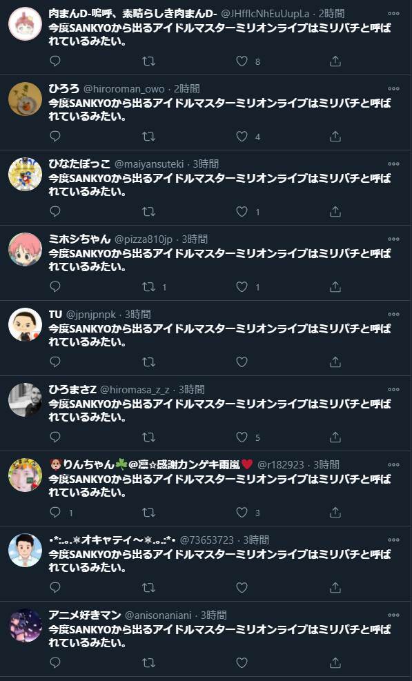 パチシタ Sankyoさん アイドルマスターミリオンライブ期待してます Sankyoのbotが一斉に呟いてトレンド乗せる 本田未央ちゃん応援まとめ速報
