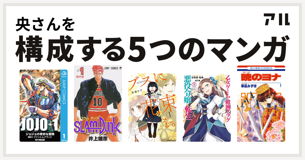 央さんを構成するマンガはslam Dunk スラムダンク ブスに花束を 乙女ゲームの破滅フラグしかない悪役令嬢に転生してしまった 暁のヨナ 私を構成する5つのマンガ アル