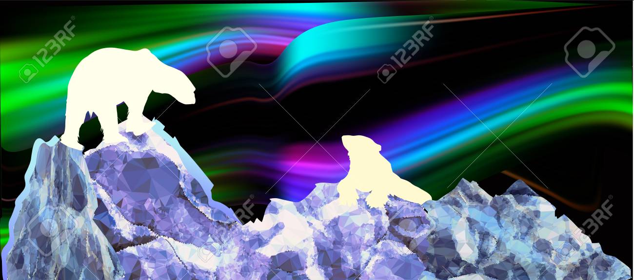 ホッキョクグマとオーロラのシルエットと北部の風景 氷の山の中で青 白 緑 ピンクと黒ポーラー ランドス ケープのイラスト素材 ベクタ Image 81920242