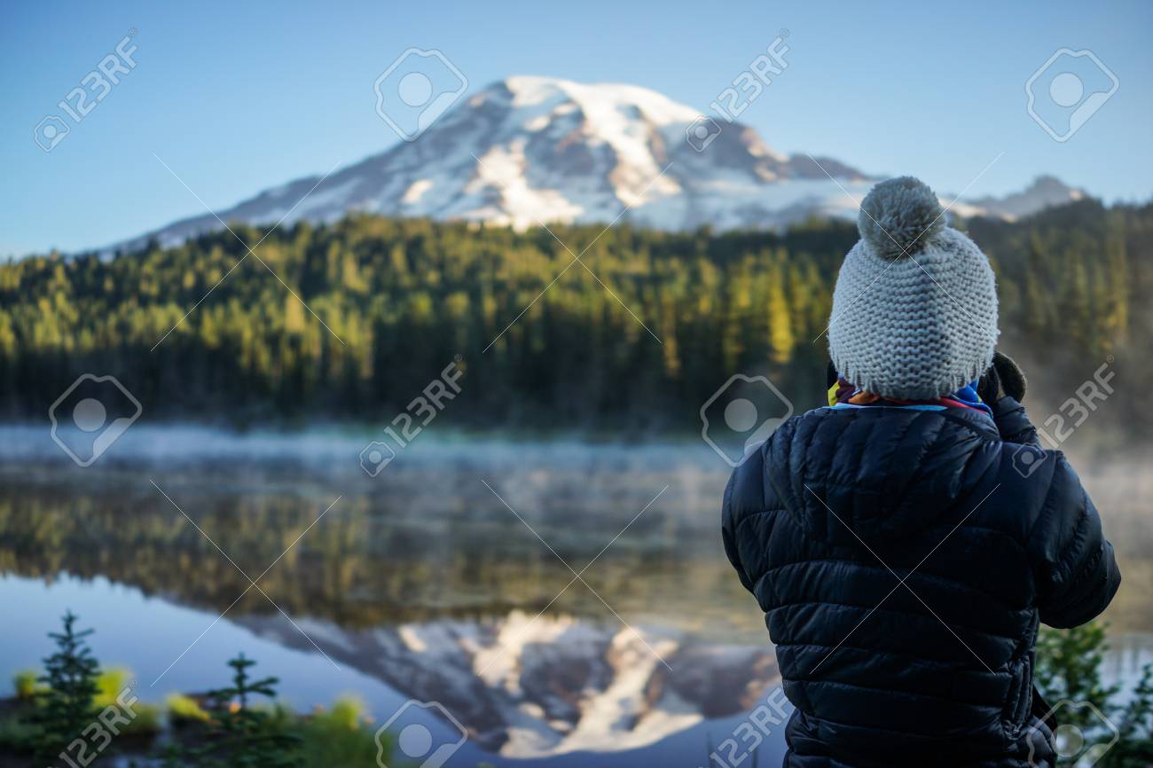 女性写真家は 山とリフレクション湖とマウント レーニエ国立公園 ワシントン湖の写真を取っています の写真素材 画像素材 Image 84937493